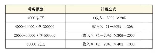個(gè)人所得稅法規(guī)定,勞務(wù)報(bào)酬所得、稿酬所得、特許權(quán)使用費(fèi)所得、財(cái)產(chǎn)租賃所得,每次收入不超過(guò)4000元的,減除費(fèi)用800元;4000元以上的,減除20%的費(fèi)用,其余額為應(yīng)納稅所得額。勞務(wù)報(bào)酬所得,適用比例稅率,稅率為20%。對(duì)勞務(wù)報(bào)酬所得一次收入畸高的,可以實(shí)行加成征收。