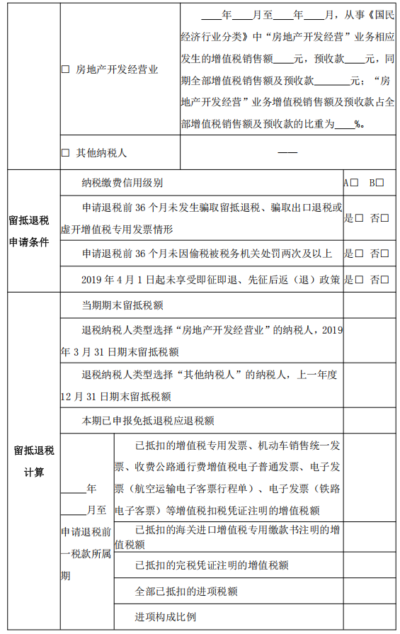 十三、退稅納稅人類型:按照《財(cái)政部 稅務(wù)總局關(guān)于完善增值稅期末留抵退稅政策的公告》(財(cái)政部 稅務(wù)總局公告 2025 年第 7 號(hào),以下簡(jiǎn)稱 7 號(hào)公告)第一條第一項(xiàng)規(guī)定申請(qǐng)留抵退稅的納稅人,根據(jù)其“制造業(yè)”“科學(xué)研究和技術(shù)服務(wù)業(yè)”“軟件和信息技術(shù)服務(wù)業(yè)”“生態(tài)保護(hù)和環(huán)境治理業(yè)”中銷售收入占比最高的一項(xiàng)選擇;按照 7 號(hào)公告第一條第二項(xiàng)規(guī)定申請(qǐng)留抵退稅的納稅人,選擇“房地產(chǎn)開發(fā)經(jīng)營(yíng)業(yè)”;按照 7 號(hào)公告第一條第三項(xiàng)規(guī)定申請(qǐng)留抵退稅的納稅人,選擇“其他納稅人”。退稅納稅人類型選擇“制造業(yè)”“科學(xué)研究和技術(shù)服務(wù)業(yè)”“軟件和信息技術(shù)服務(wù)業(yè)”或“生態(tài)保護(hù)和環(huán)境治理業(yè)”的納稅人,應(yīng)填寫“ 年 月至 年 月,從事《國(guó)民經(jīng)濟(jì)行業(yè)分類》中‘制造業(yè)’‘科學(xué)研究和技術(shù)服務(wù)業(yè)’‘軟件和信息技術(shù)服務(wù)業(yè)’‘生態(tài)保護(hù)和環(huán)境治理業(yè)’業(yè)務(wù)相應(yīng)發(fā)生的增值稅銷售額 元,同期全部增值稅銷售額 元,占比 %?!比缟暾?qǐng)退稅前經(jīng)營(yíng)期滿 12 個(gè)月,本欄起止時(shí)間填寫申請(qǐng)退稅前 12 個(gè)月的起止時(shí)間,本欄銷售額填寫申請(qǐng)退稅前 12 個(gè)月的銷售額;如申請(qǐng)退稅前經(jīng)營(yíng)期不滿 12 個(gè)月但滿 3 個(gè)月的,本欄起止時(shí)間填寫實(shí)際經(jīng)營(yíng)期的起止時(shí)間,本欄銷售額填寫實(shí)際經(jīng)營(yíng)期的銷售額。退稅納稅人類型選擇“房地產(chǎn)開發(fā)經(jīng)營(yíng)業(yè)”的納稅人,應(yīng)填寫“ 年 月至 年 月,從事《國(guó)民經(jīng)濟(jì)行業(yè)分類》中‘房地產(chǎn)開發(fā)經(jīng)營(yíng)’業(yè)務(wù)相應(yīng)發(fā)生的增值稅銷售額 元,預(yù)收款 元,同期全部增值稅銷售額及預(yù)收款元,‘房地產(chǎn)開發(fā)經(jīng)營(yíng)’業(yè)務(wù)增值稅銷售額及預(yù)收款占全部增值稅銷售額及預(yù)收款的比重為 %?!比缟暾?qǐng)退稅前經(jīng)營(yíng)期滿 12 個(gè)月,本欄起止時(shí)間填寫申請(qǐng)退稅前 12 個(gè)月的起止時(shí)間,本欄銷售額和預(yù)收款填寫申請(qǐng)退稅前 12 個(gè)月的銷售額和預(yù)收款;如申請(qǐng)退稅前經(jīng)營(yíng)期不滿 12 個(gè)月但滿 3 個(gè)月的,本欄起止時(shí)間填寫實(shí)際經(jīng)營(yíng)期的起止時(shí)間,本欄銷售額和預(yù)收款填寫實(shí)際經(jīng)營(yíng)期的銷售額和預(yù)收款。