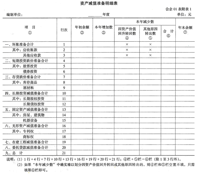 答:根據(jù)《企業(yè)會(huì)計(jì)制度》及相關(guān)會(huì)計(jì)準(zhǔn)則的規(guī)定,企業(yè)應(yīng)在對(duì)外提供的財(cái)務(wù)報(bào)告中披露有關(guān)資產(chǎn)減值準(zhǔn)備的信息。企業(yè)在會(huì)計(jì)報(bào)表附注中披露資產(chǎn)減值準(zhǔn)備減少的信息時(shí),應(yīng)區(qū)分由于資產(chǎn)價(jià)值回升而產(chǎn)生的資產(chǎn)減值準(zhǔn)備轉(zhuǎn)回的金額和由于其他原因(如出售該項(xiàng)資產(chǎn)、非貨幣性交易、債務(wù)重組等)所轉(zhuǎn)出的資產(chǎn)減值準(zhǔn)備的金額兩類(lèi)信息。有關(guān)資產(chǎn)減值準(zhǔn)備明細(xì)表改按以下格式編報(bào):